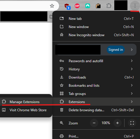 In your browser, click on the 3 vertical dots in the top right, and choose Extensions > Manage Extensions: